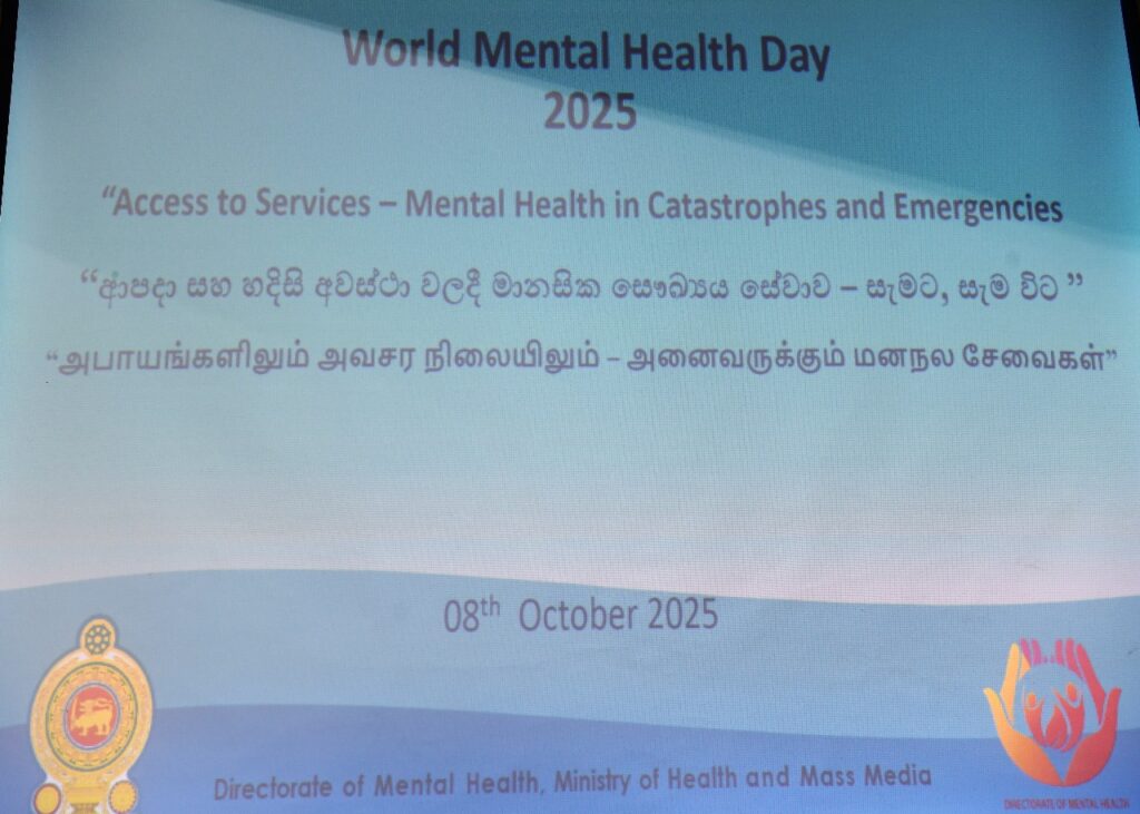 ලෝක මානසික සෞඛ්ය දිනය සෑම වර්ෂයකම ඔක්තොම්බර් මස 10 වන දිනට යෙදී ඇත. ඒ වෙනුවෙන් සෞඛ්ය හා ජනමාධ්ය අමාත්ය වෛද්ය නලින්ද ජයතිස්ස මහතාගේ උපදෙස් හා මඟපෙන්වීම මත පැවැත් වූ ජාතික සැමරුම් උත්සවය අද (08) පෙරවරුවේ සෞඛ්ය හා ජනමාධ්ය නියෝජ්ය අමාත්ය වෛද්ය හංසක විජේමුණි සහ සෞඛ්ය සේවා අධ්යක්ෂ ජනරාල් වෛද්ය අසේල ගුණවර්ධන යන මහත්වරුන්ගේ ප්රධානත්වයෙන් ශ්රී ලංකා පදනම් ආයතන ශ්රවණාගාරයේ දී පැවැත්විණි.