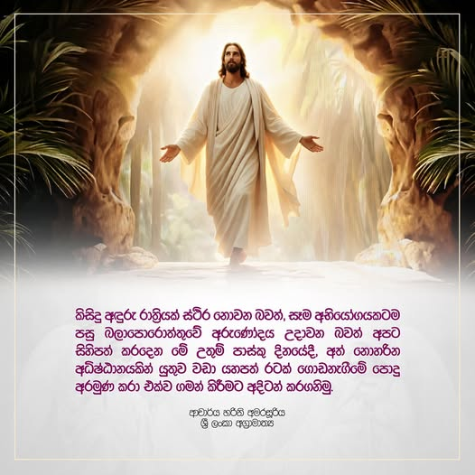 එහෙත්, කිසිදු අඳුරු රාත්රියක් ස්ථිර නොවන බවත්, සෑම අභියෝගයකටම පසු බලාපොරොත්තුවේ අරුණෝදය උදාවන බවත් පාස්කු පණිවුඩය අපට සිහිපත් කර දෙයි. එය ජීවිතය අලුතින් ආරම්භ කිරීමටත්, අත් නොහරින අධිෂ්ඨානයෙන් යුතුව ඉදිරියට යාමටත් අපව දිරිමත් කරයි.