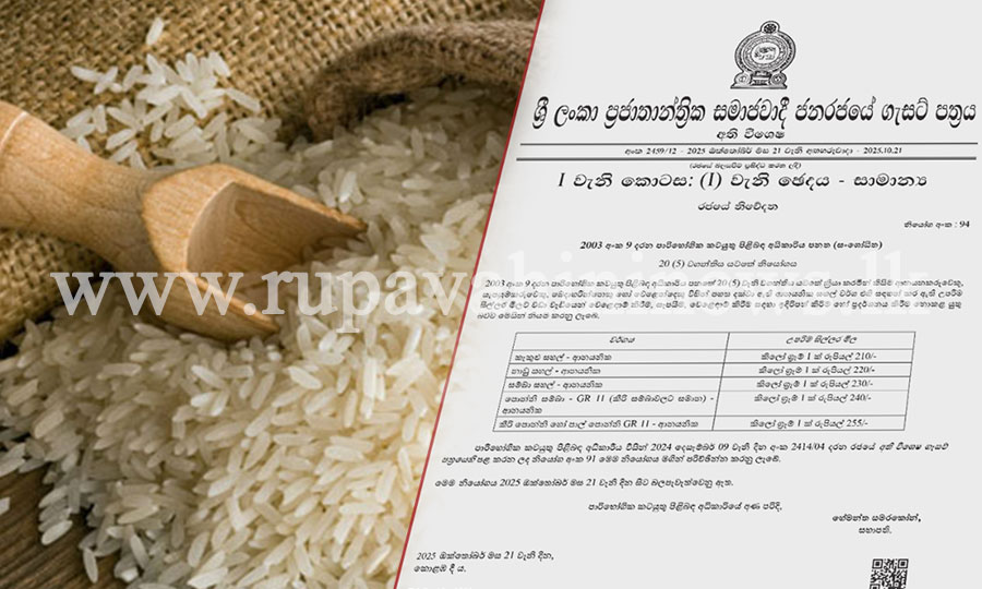 ආනයනික සහල් සඳහා උපරිම සිල්ලර මිලක් නියම කරමින් ගැසට් නිවේදනයක් නිකුත් කර තිබෙනවා.