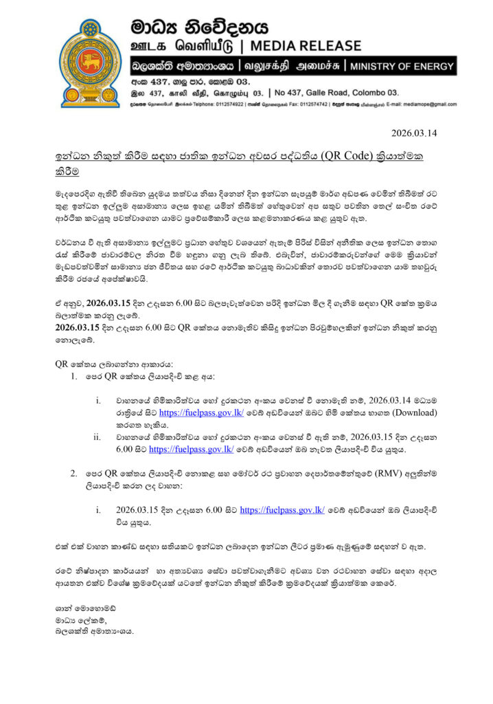 ඒ අනුව 2026.03.15 දින (අද) උදෑසන 06.00 සිට බලපැවැත්වෙන පරිදි ඉන්ධන මිලදී ගැනීම සදහා QR කේත ක්රමය ක්රියාත්මක කරනු ලබන අතර අද දින උදෑසන 06.00 සිට අදාල කේතය නොමැතිව කිසිදු ඉන්ධන පිරවුම්හලකින් ඉන්ධන නිකුත් කරනු නොලැබේ.