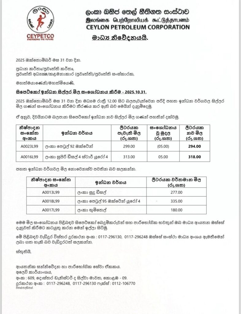 මාසික ඉන්ධන මිල සංශෝධනය අනුව අද (31) රාත්‍රී 12.00 සිට බලපැවැත්වෙන පරිදි නවතම ඉන්ධන මිල ගණන් සම්බන්ධව ලංකා ඛණිජ තෙල් නීතිගත සංස්ථාව නිවේදනයක් නිකුත් කර තිබෙනවා.
