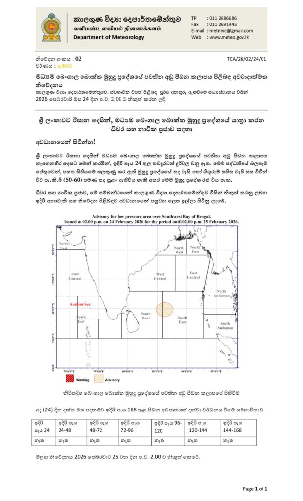 ශ්රී ලංකාවට ඊසාන දෙසින් මධ්යම බෙංගාල බොක්ක මුහුදු ප්රදේශයේ පවතින අඩුපීඩන කලාපය නැගෙනහිර දෙසට ගමන් කරමින්, ඉදිරි පැය 24 තුළ තවදුරටත් දුර්වල වනු ඇතැයි එම නිවේදනයේ වැඩිදුරටත් සඳහන් වනවා.