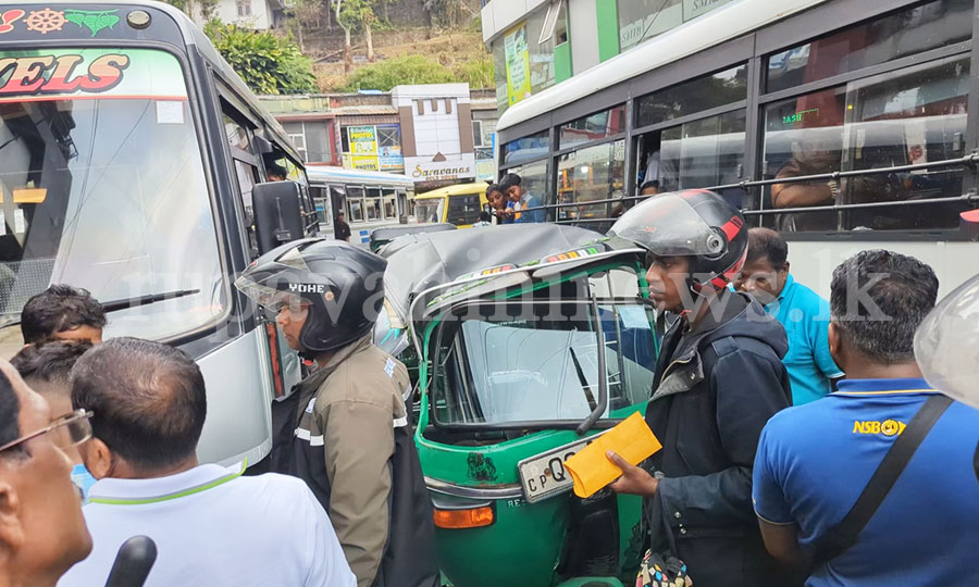 හැටන් පැති වීදිය හරහා එකම දිසාවට ධාවනය වූ පෞද්ගලික බස් රථ දෙකක් මැදින් අපරික්ෂාකාරීව එම දිසාවටම ධාවනය කළ ත්රී රෝද රථයක් බස් රථ දෙකේම ගැටි අද (12) දින පස්වරුවේ අනතුරක් සිදුව තිබෙනවා.