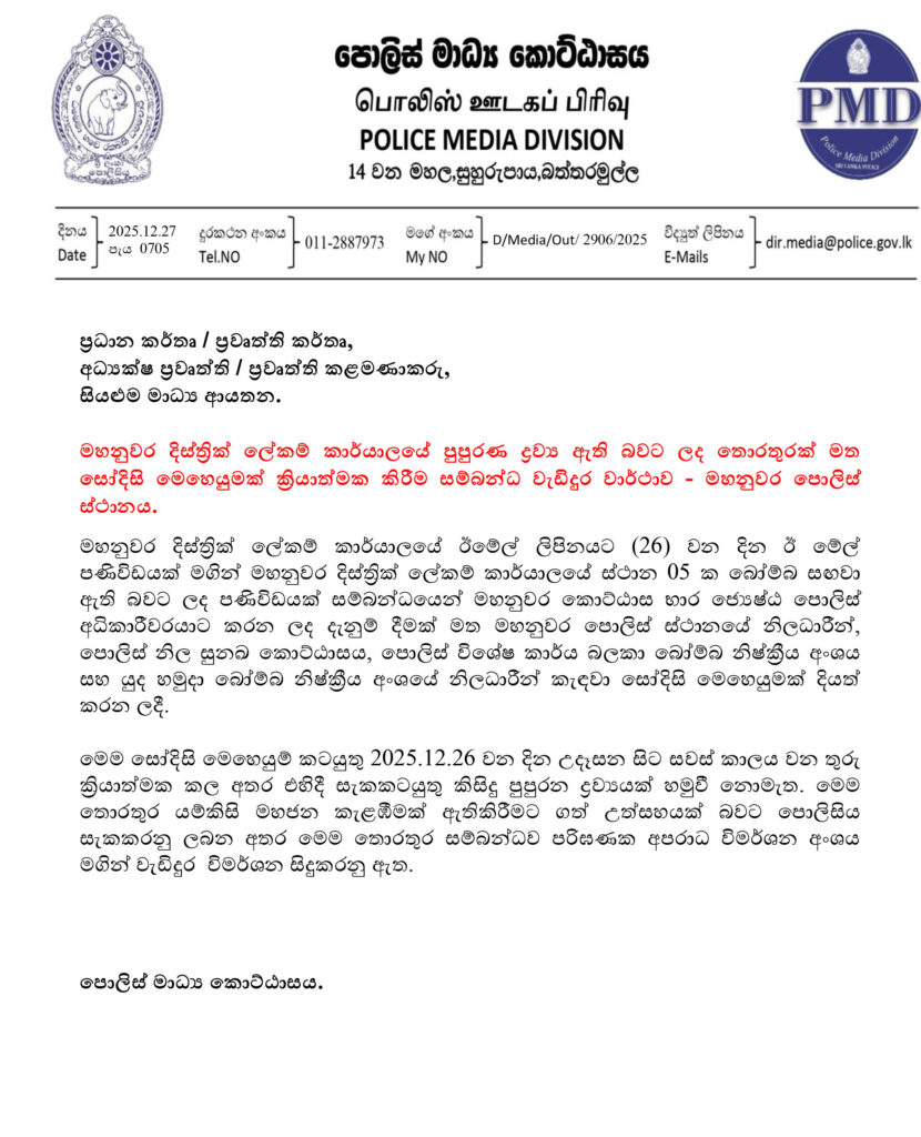 මහනුවර දිස්ත්‍රික් ලේකම් කාර්යාලයේ ඊමේල් ලිපිනයට (26) වන දින ඊමේල් පණිවිඩයක් මගින් මහනුවර දිස්ත්‍රික් ලේකම් කාර්යාලයේ ස්ථාන 05ක බෝම්බ සඟවා ඇති බවට ලද පණිවිඩයක් සම්බන්ධයෙන් මහනුවර කෝට්ඨාස භාර ජ්‍යෙෂ්ඨ පොලිස් අධිකාරිවරයාට කරන ලද දැනුම්දීමක් මත මහනුවර පොලිස් ස්ථානයේ නිලධාරින්, පොලිස් නිල සුනඛ කොට්ඨාසය, පොලිස් විශේෂ කාර්ය බලකා බෝම්බ නිෂ්ක්‍රීය අංශය සහ යුද හමුදා බෝම්බ නිෂ්ක්‍රීය අංශයේ නිලධාරින් එක්ව  සිදුකළ සෝදිසි මෙහෙයුමේදී කිසිදු සැකකටයුතු පුපුරන ද්‍රව්‍යයක් හමුවී නොමැති බවට පොලිසිය පවසවනවා.