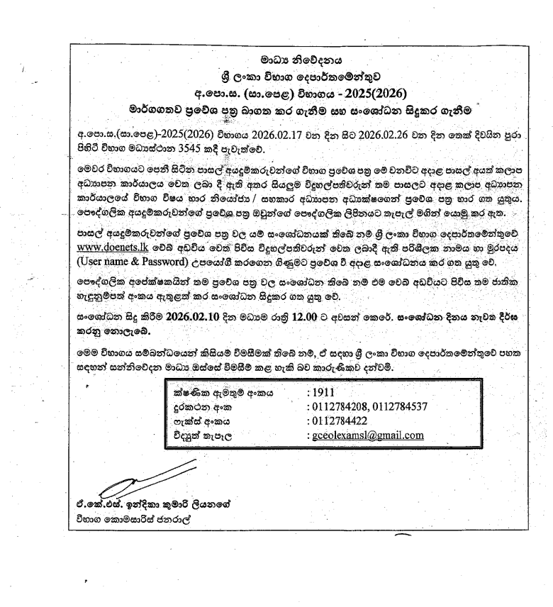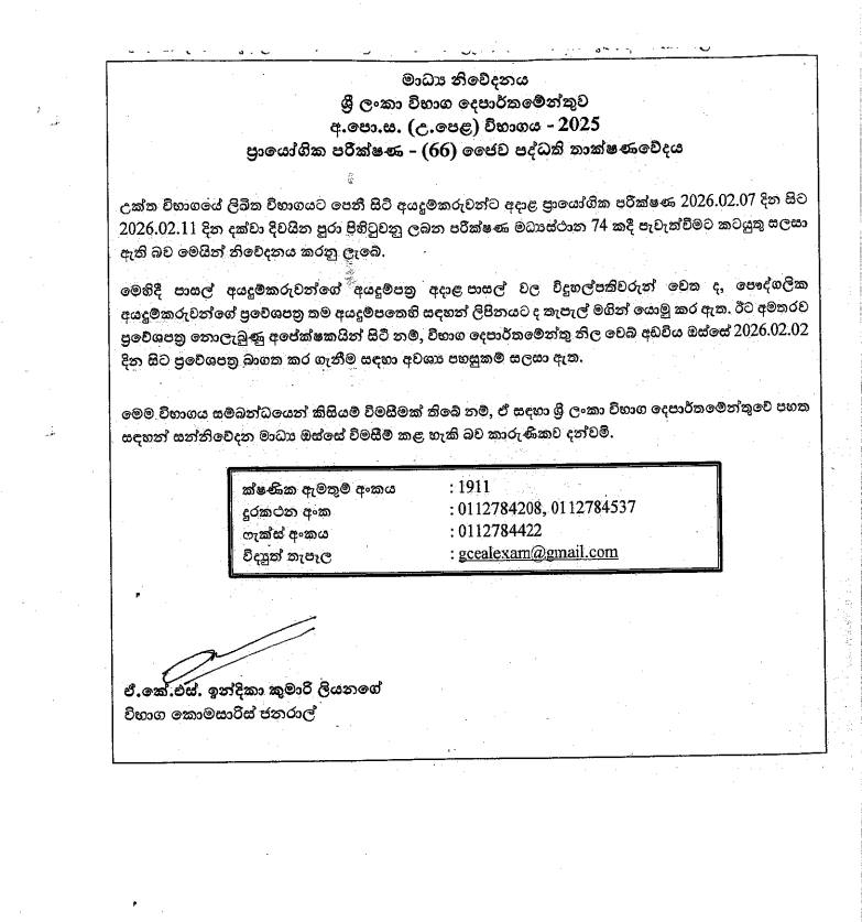 අධ්යාපන අමාත්යාංශය මගින් අ.පො.ස සාමාන්ය පෙළ විභාගය සහ අ.පො.ස. උසස්පෙළ ප්රායෝගික පරීක්ෂන පැවැත්වෙන දින ගණන් සදහන් නිවේදනයක් නිකුත් කර තිබේ.